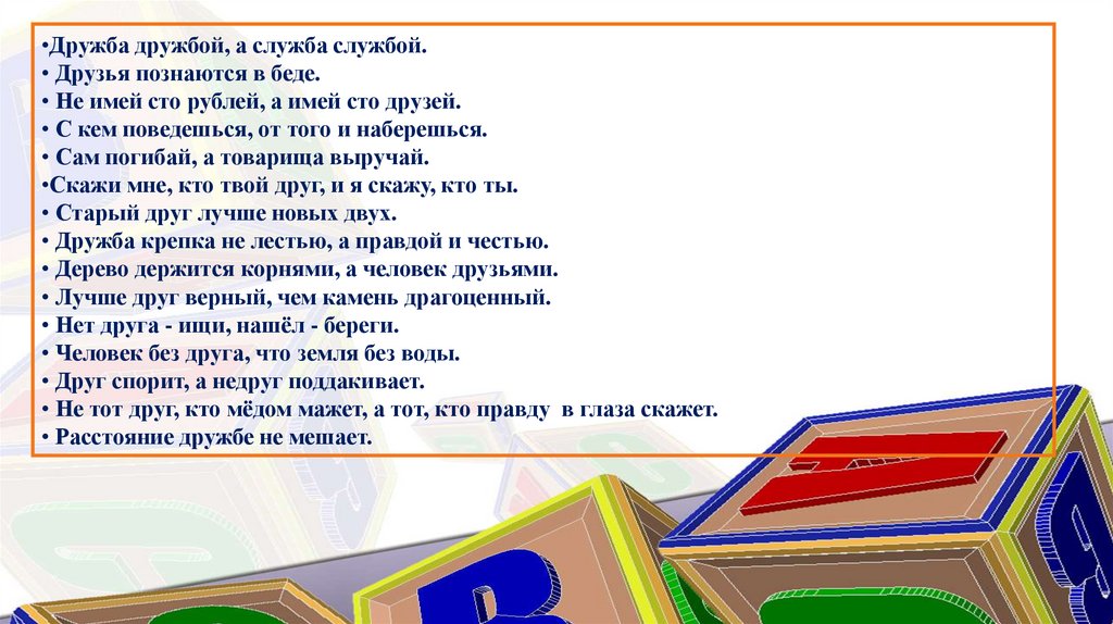 •Дружба дружбой, а служба службой.• Друзья познаются в беде.