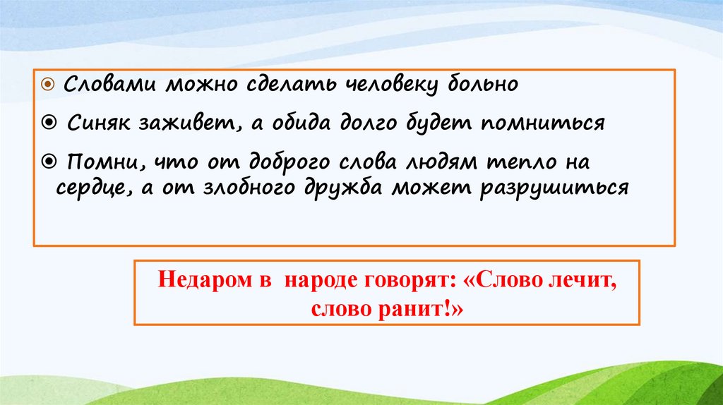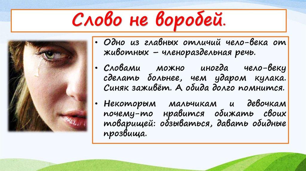 Словами можно сделать человеку больноСиняк заживет, а обида долго будет помниться