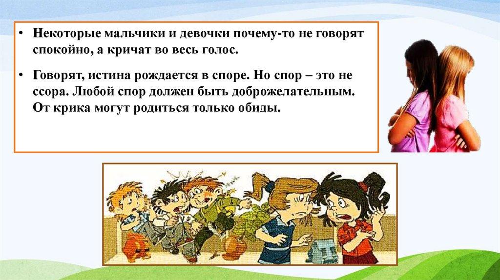 • Некоторые мальчики и девочки почему-то не говорятспокойно, а кричат во весь голос.