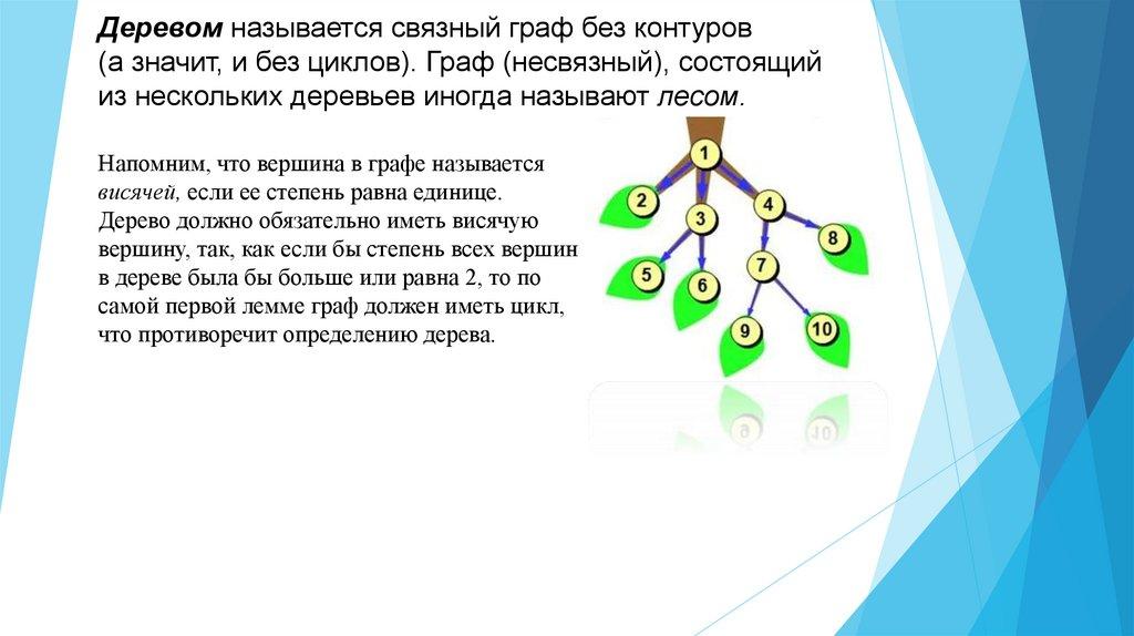 Деревом называется связный граф без контуров(а значит, и без циклов). Граф (несвязный), состоящий
