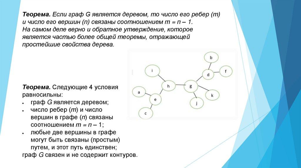 Теорема. Если граф G является деревом, то число его ребер (т)и число его вершин (п) связаны соотношением т = п – 1.
