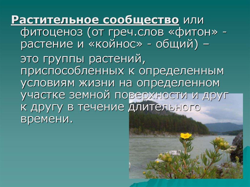 Растительное сообщество илифитоценоз (от греч.слов «фитон» растение и «койнос» - общий) –