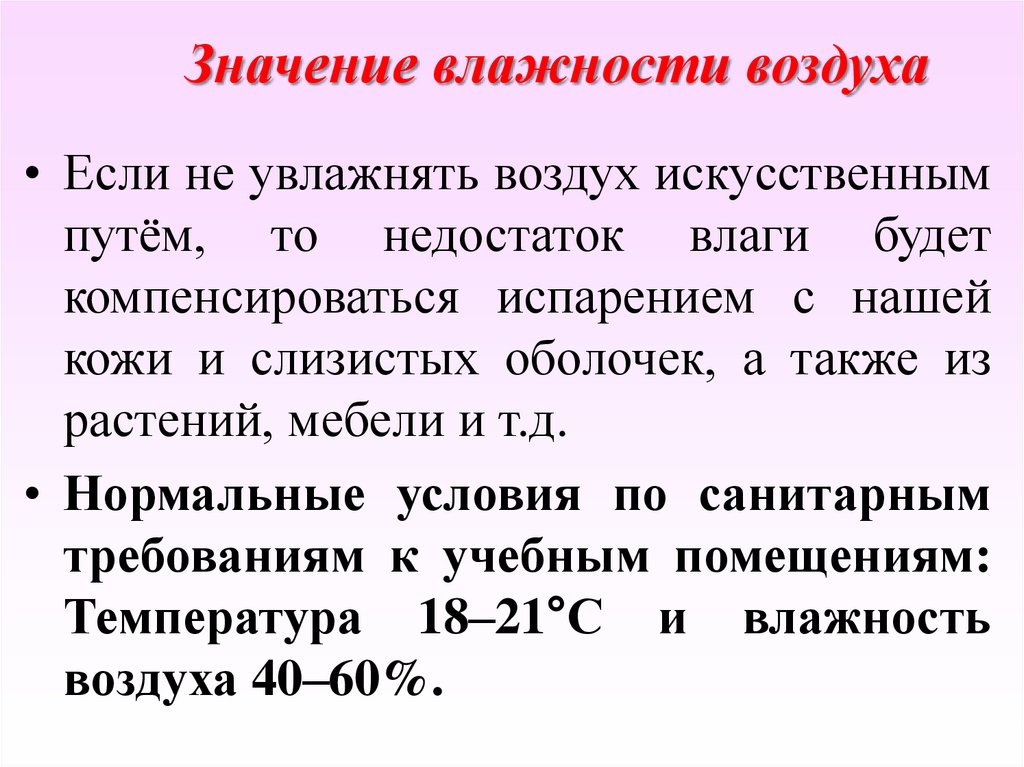 Значение влажности воздуха• Если не увлажнять воздух искусственным