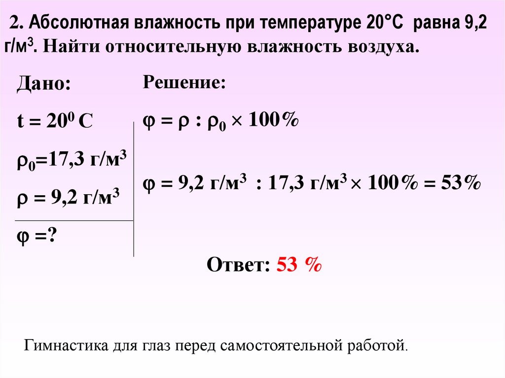 1. 1.Какова абсолютная влажность воздуха,который в объеме 20 м3 содержит 100 г влаги?