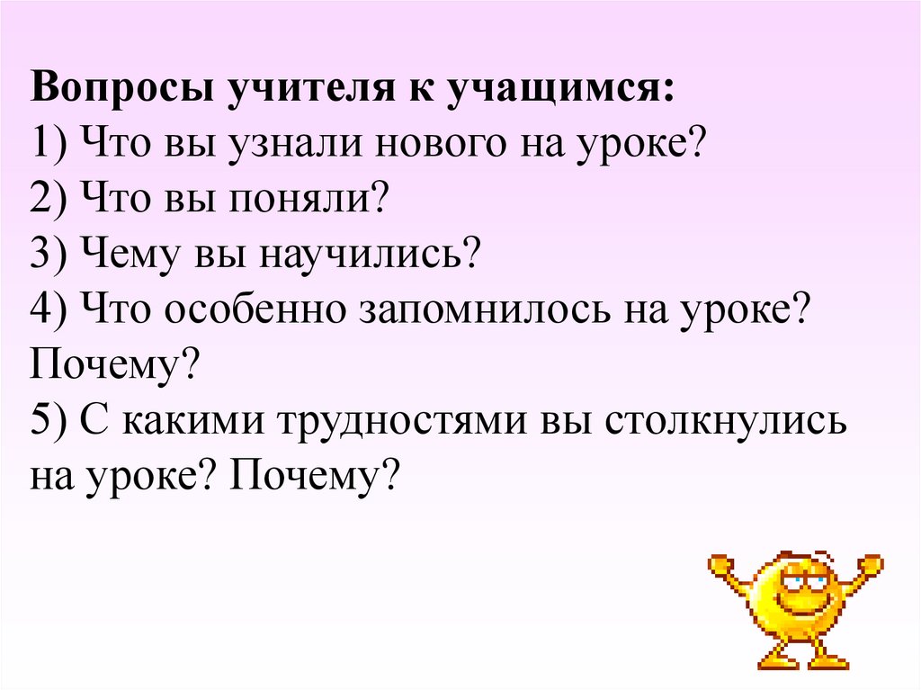 Вопросы учителя к учащимся:1) Что вы узнали нового на уроке?