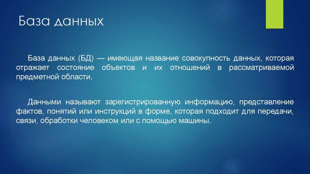 База данныхБаза данных (БД) — имеющая название совокупность данных, которая