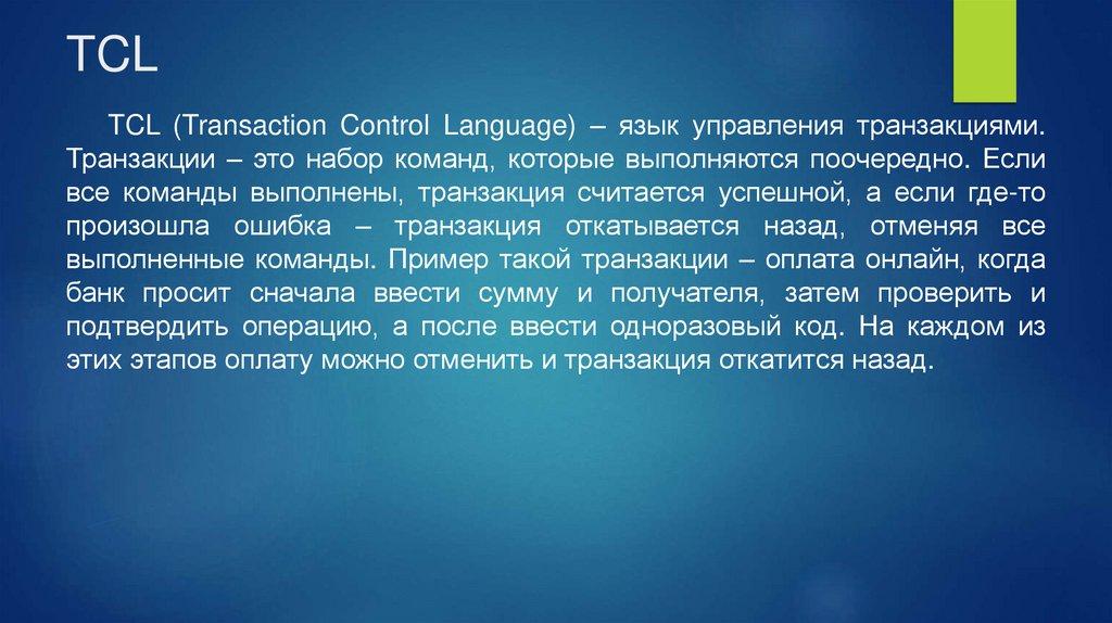 TCLTCL (Transaction Control Language) – язык управления транзакциями.