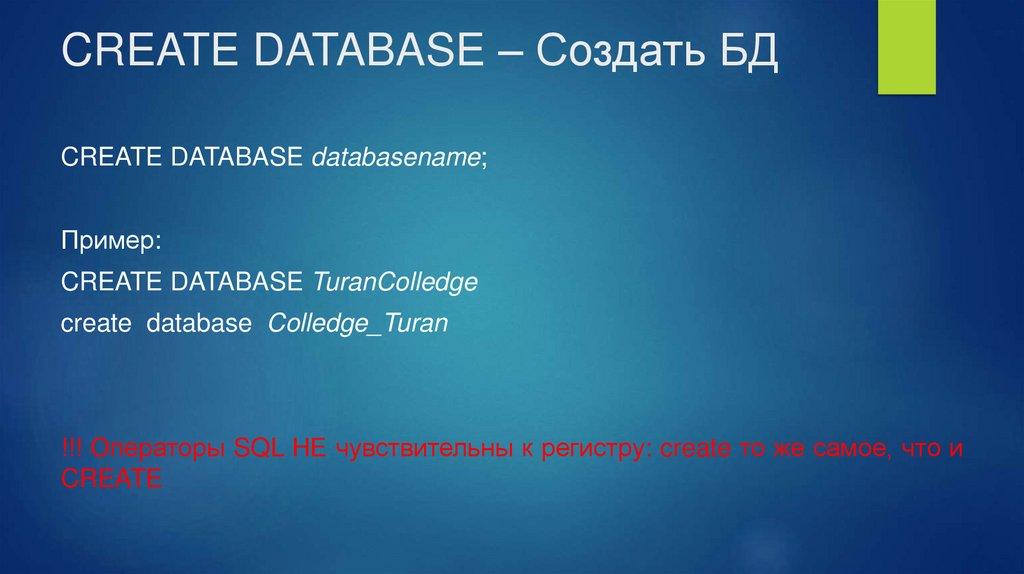 CREATE DATABASE – Создать БДCREATE DATABASE databasename;