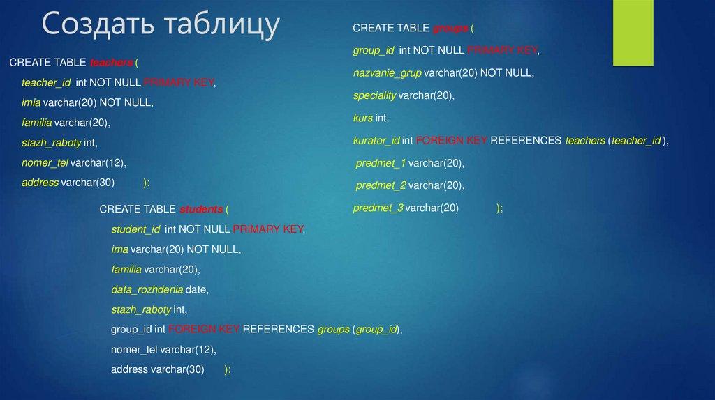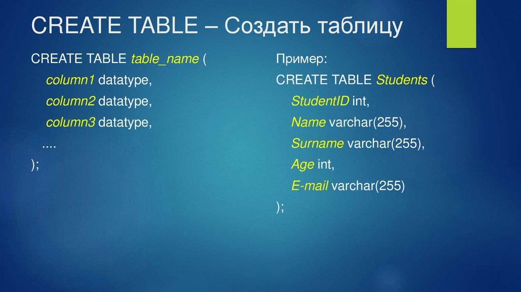 CREATE TABLE – Создать таблицуCREATE TABLE table_name (