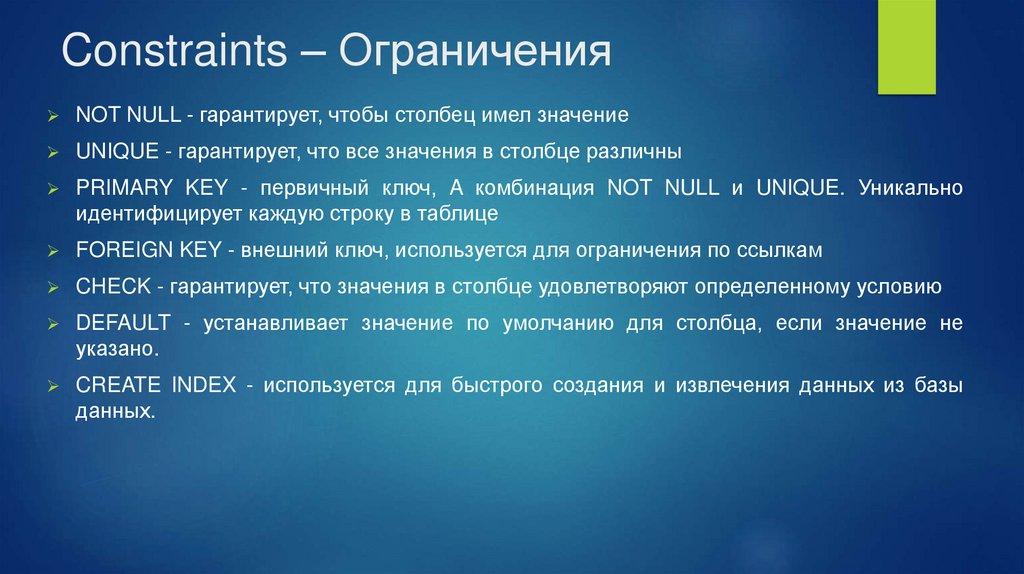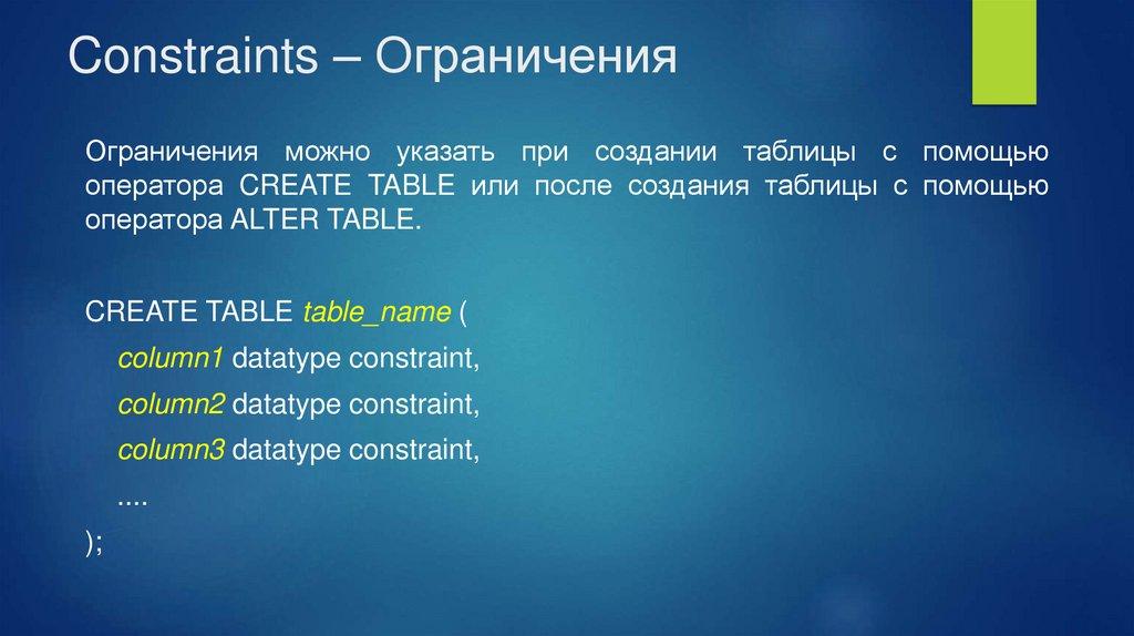 Constraints – ОграниченияОграничения можно указать при создании таблицы с помощью