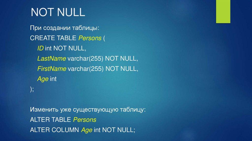 Constraints – ОграниченияNOT NULL - гарантирует, чтобы столбец имел значение
