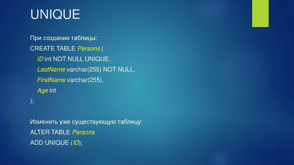 UNIQUE - гарантирует, что все значения в столбце различны