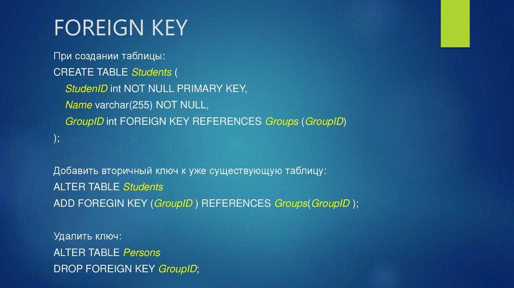 FOREIGN KEY - внешний ключ, используется для ограничения по ссылкам
