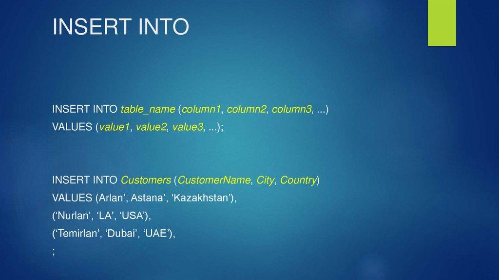 VALUES (Arlan’, Astana’, ‘Kazakhstan’),