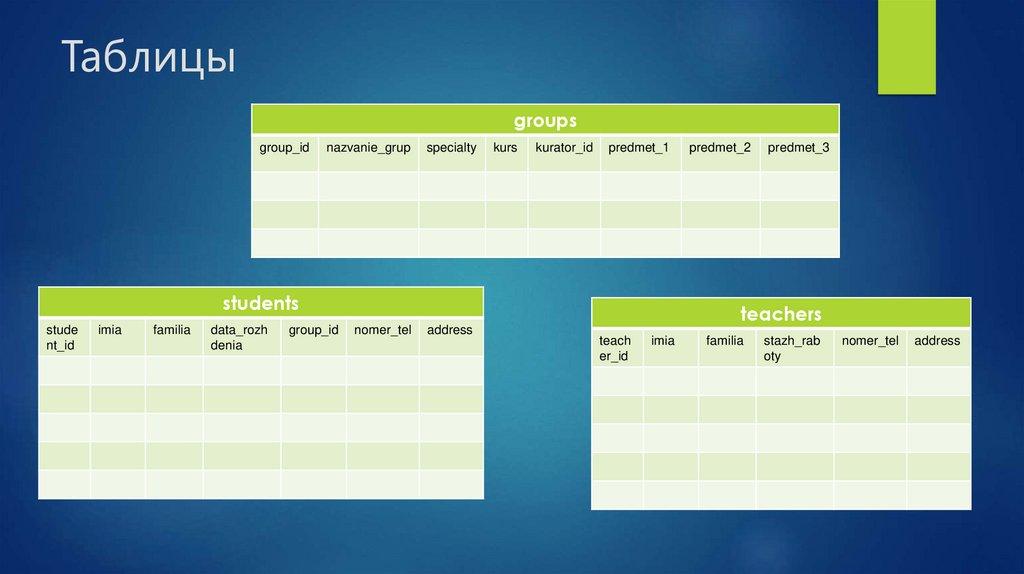 состоящих из столбцов и строк. В таблицах хранится информация об