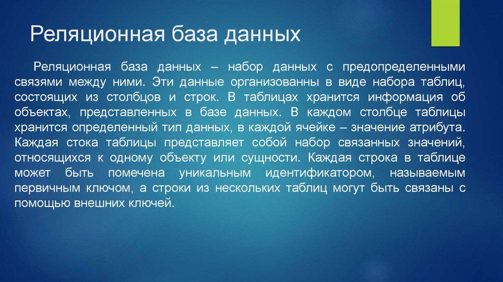 Реляционная база данныхРеляционная база данных – набор данных с предопределенными