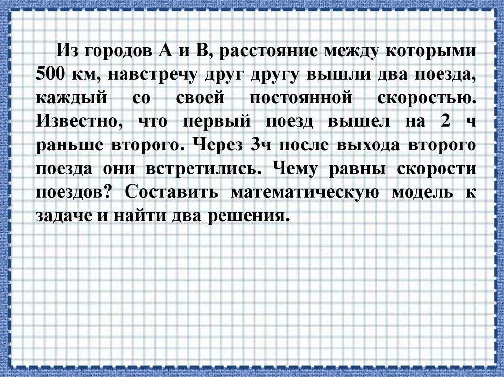 Из городов А и В, расстояние между которыми 500 км, навстречу другдругу вышли два поезда, каждый со своей постоянной скоростью.