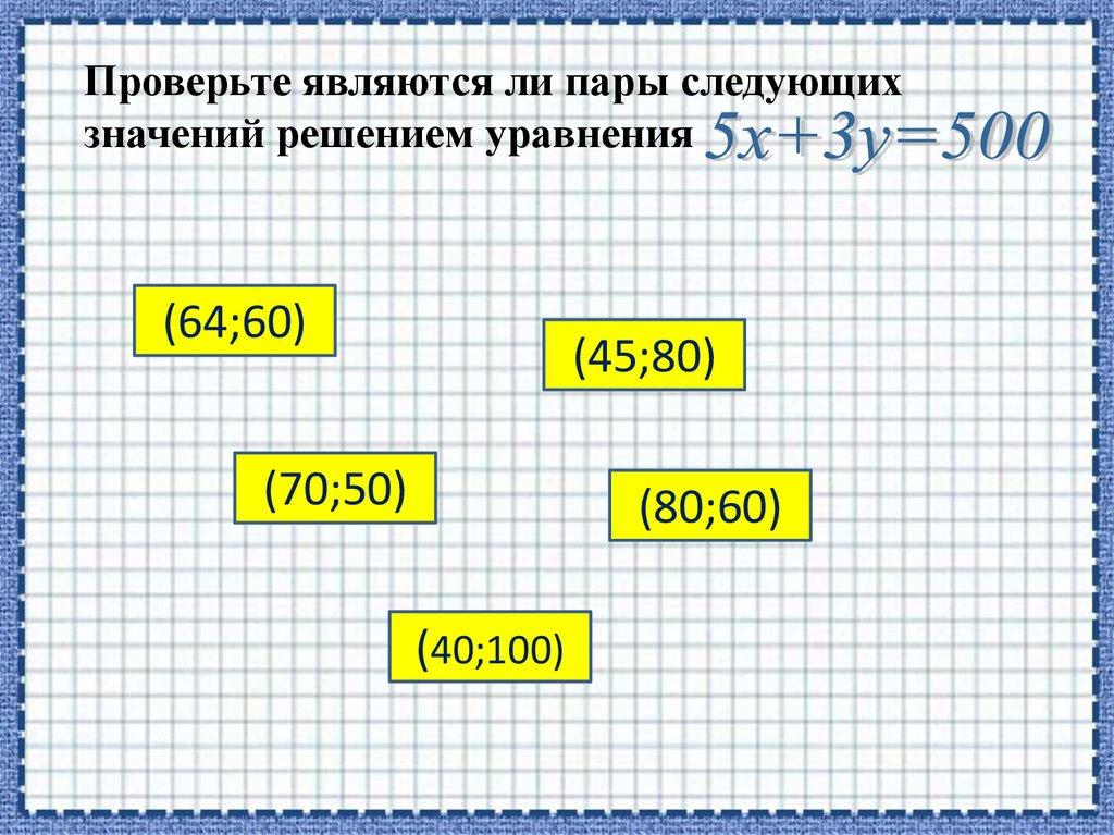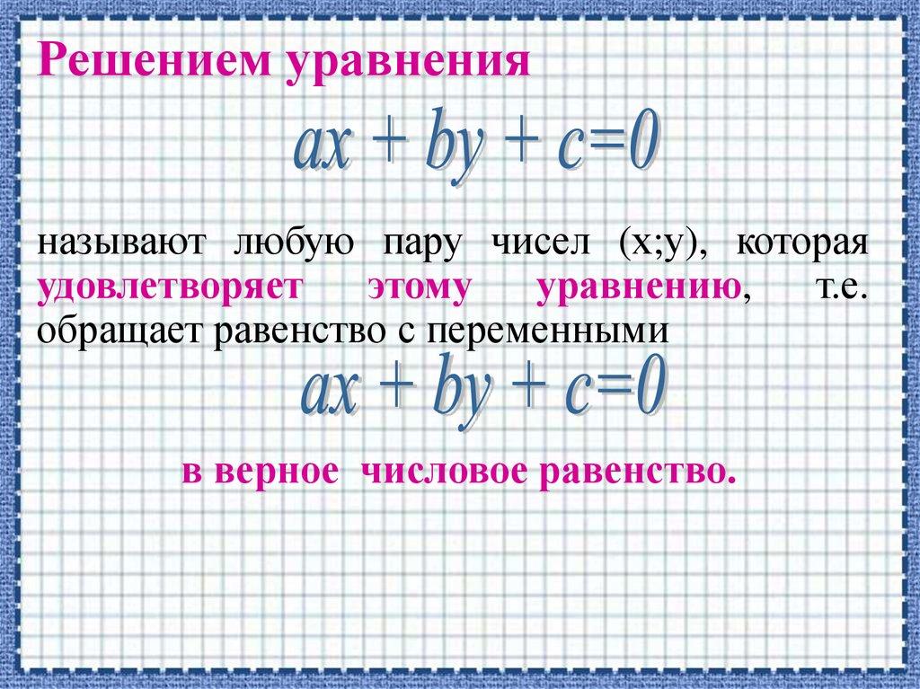 Решением уравненияназывают любую пару чисел (х;у), которая