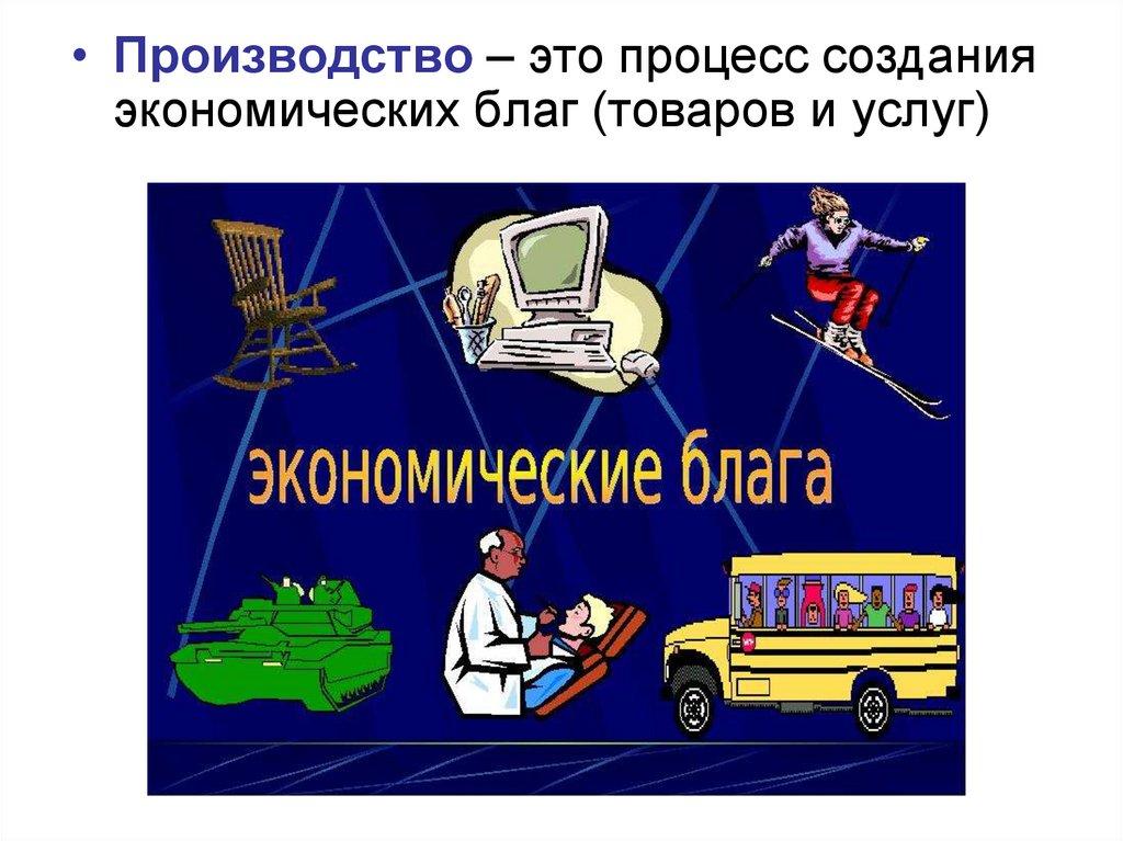 • Производство – это процесс созданияэкономических благ (товаров и услуг)