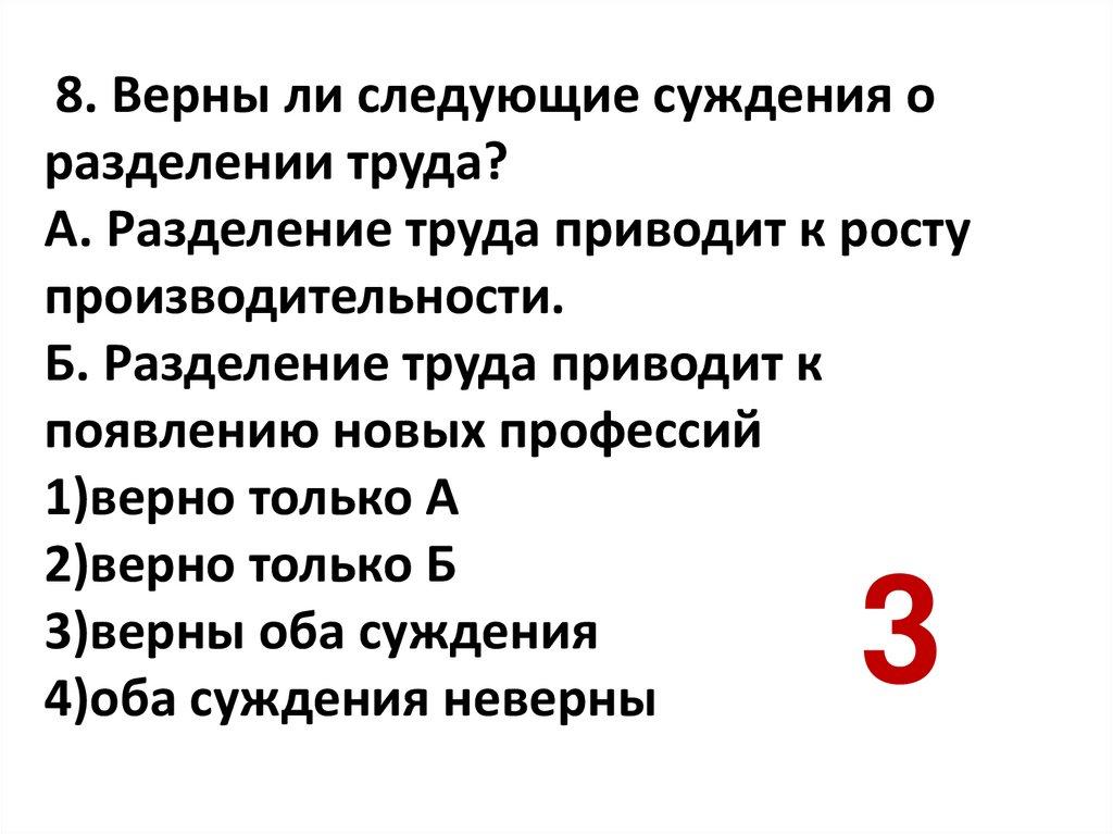 8. Верны ли следующие суждения оразделении труда?
