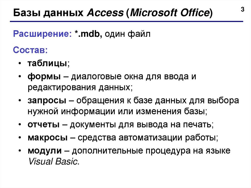 Базы данных Access (Microsoft Office)Расширение: *.mdb, один файл