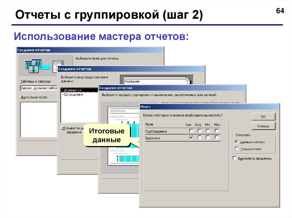 Отчеты с группировкой (шаг 2)Использование мастера отчетов: