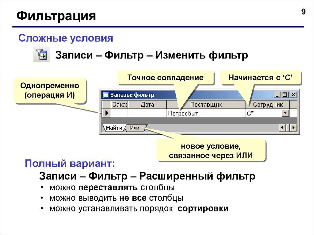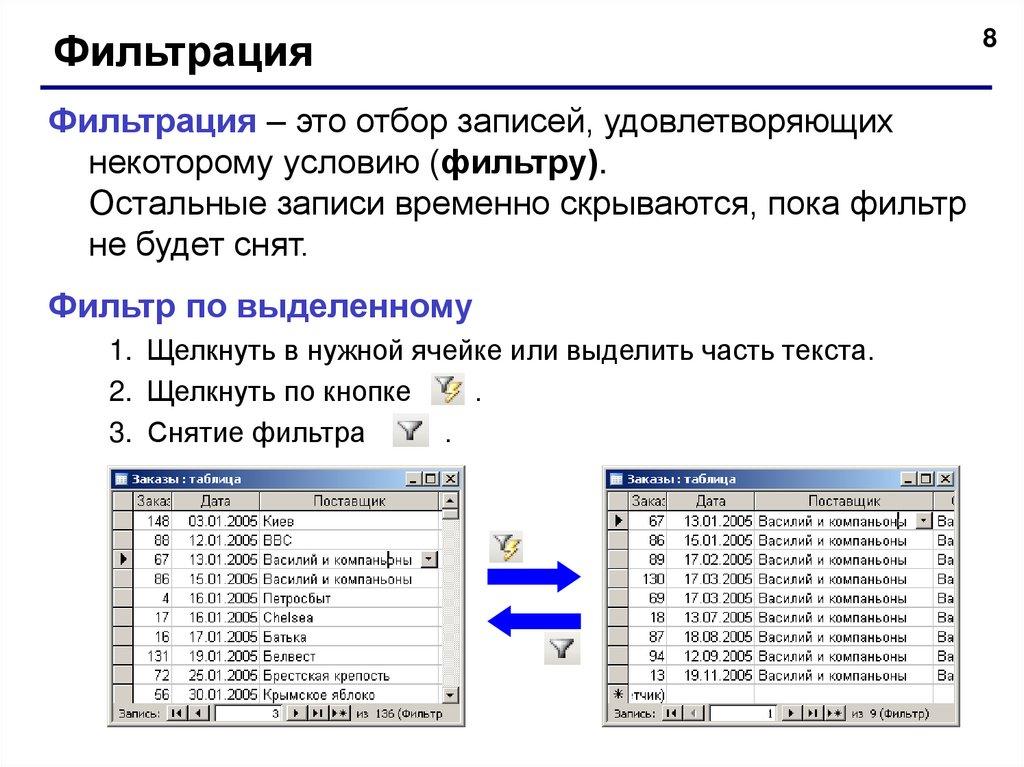 ФильтрацияФильтрация – это отбор записей, удовлетворяющих