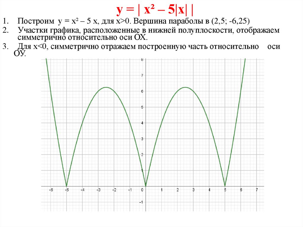у = | х² – 5|х| |Построим у = х² – 5 х, для х>0. Вершина параболы в (2,5; -6,25)