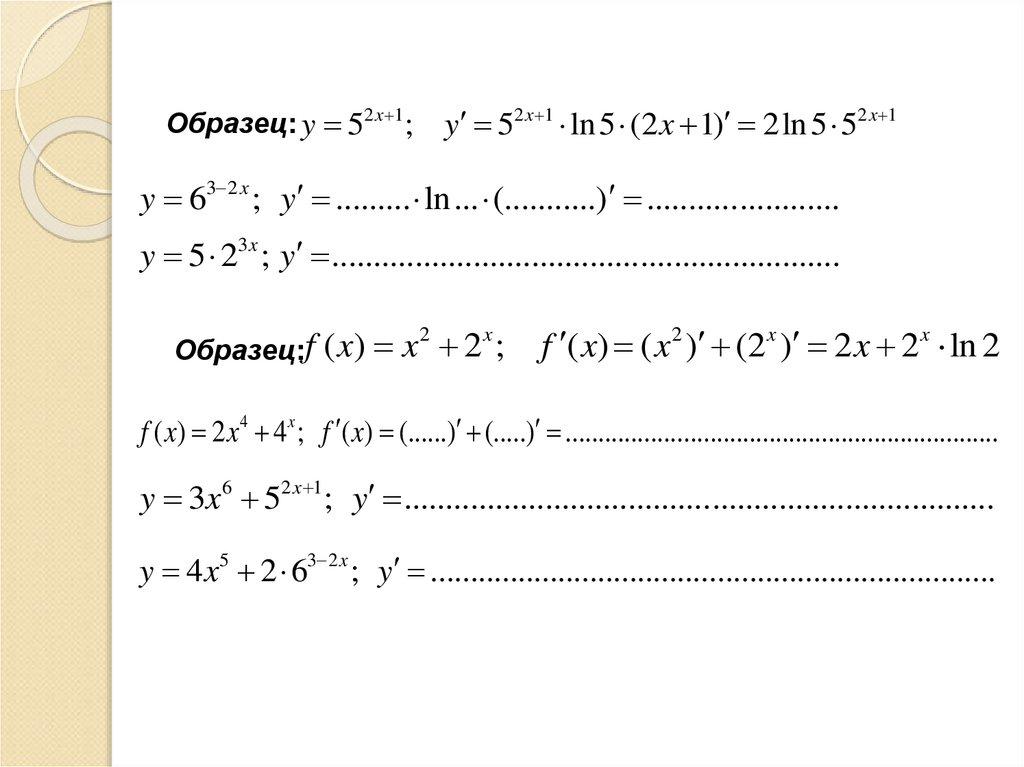 y 52 x 1 ln 5 (2 x 1) 2ln 5 52 x 1Образец: y 52 x 1;