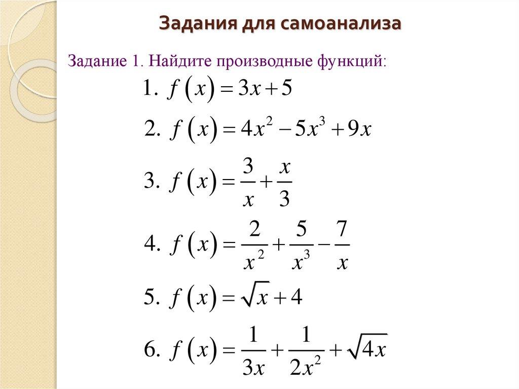 Задания для самоанализаЗадание 1. Найдите производные функций: