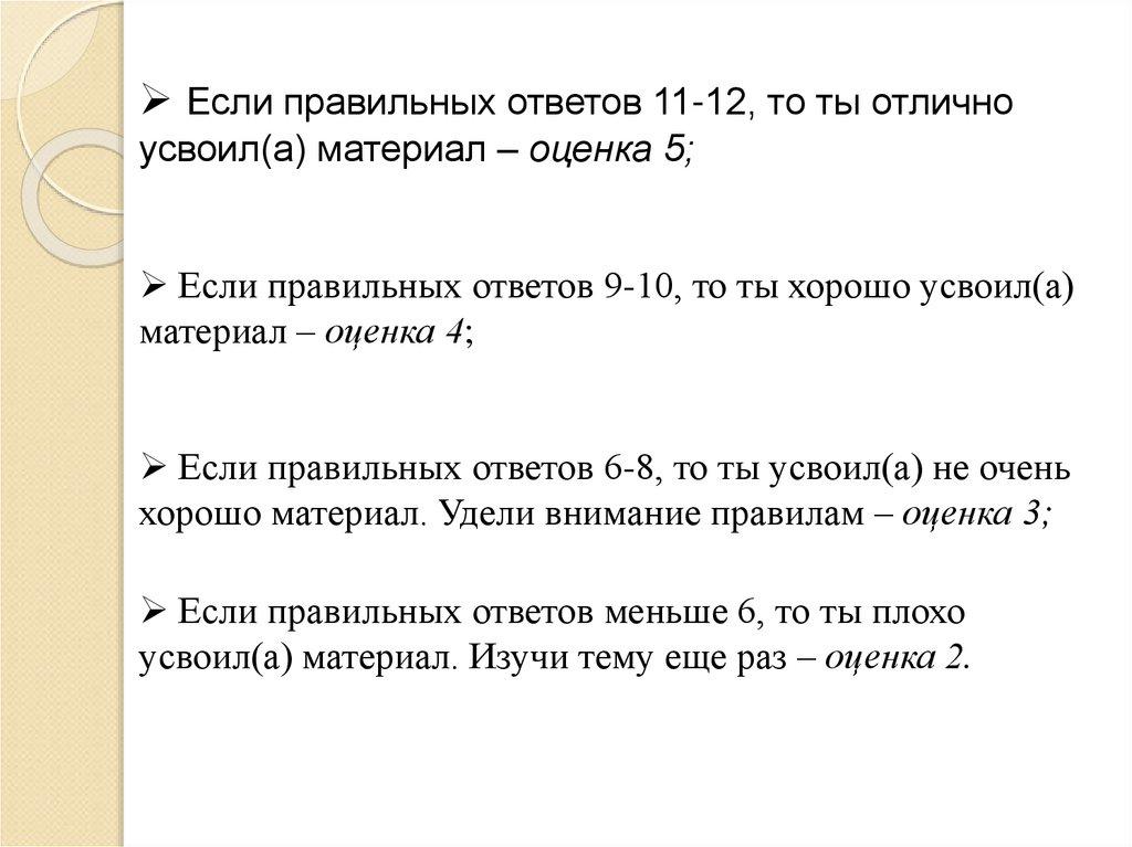 Если правильных ответов 11-12, то ты отличноусвоил(а) материал – оценка 5;