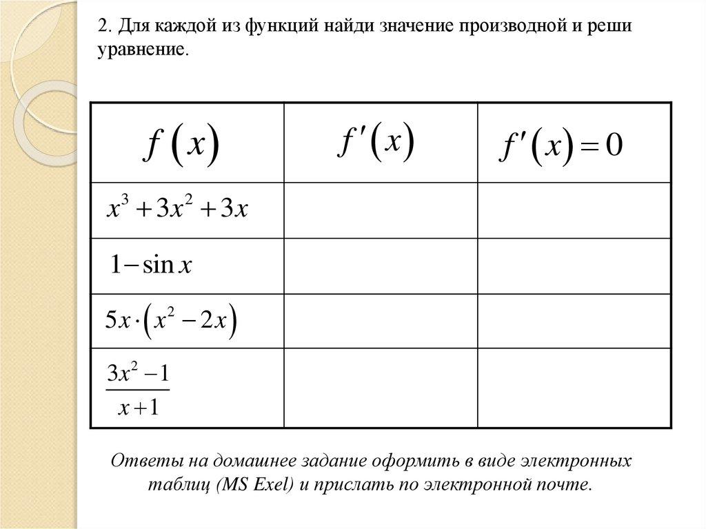 2. Для каждой из функций найди значение производной и решиуравнение.