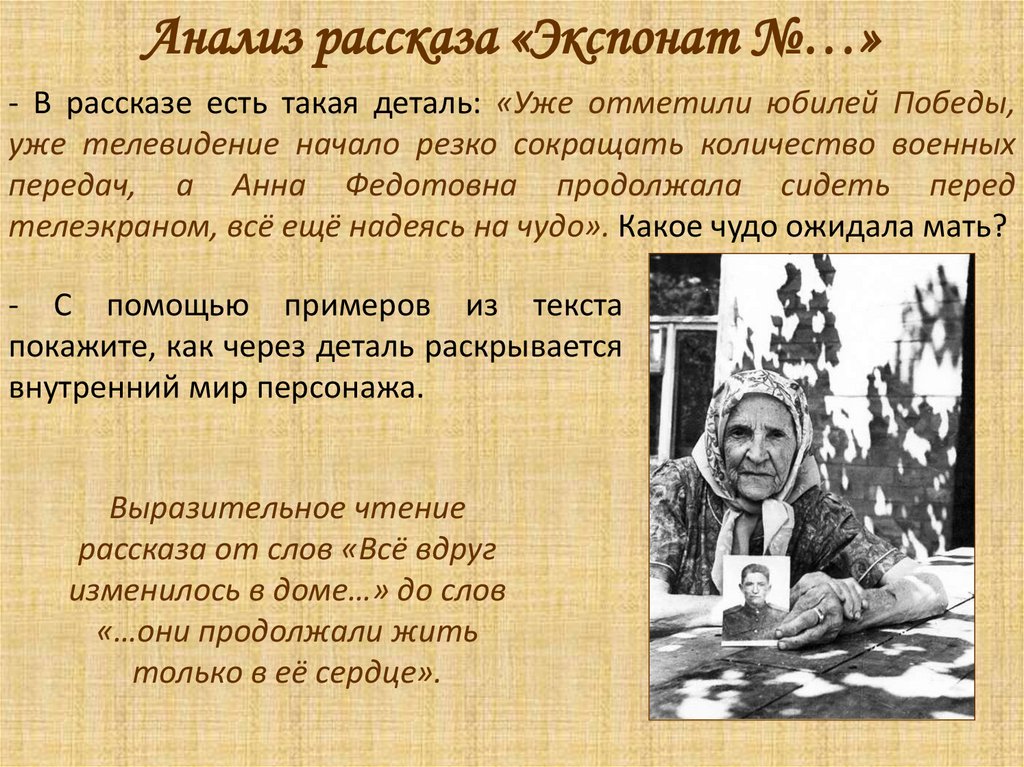 Анализ рассказа «Экспонат №…»- В рассказе есть такая деталь: «Уже отметили юбилей Победы,