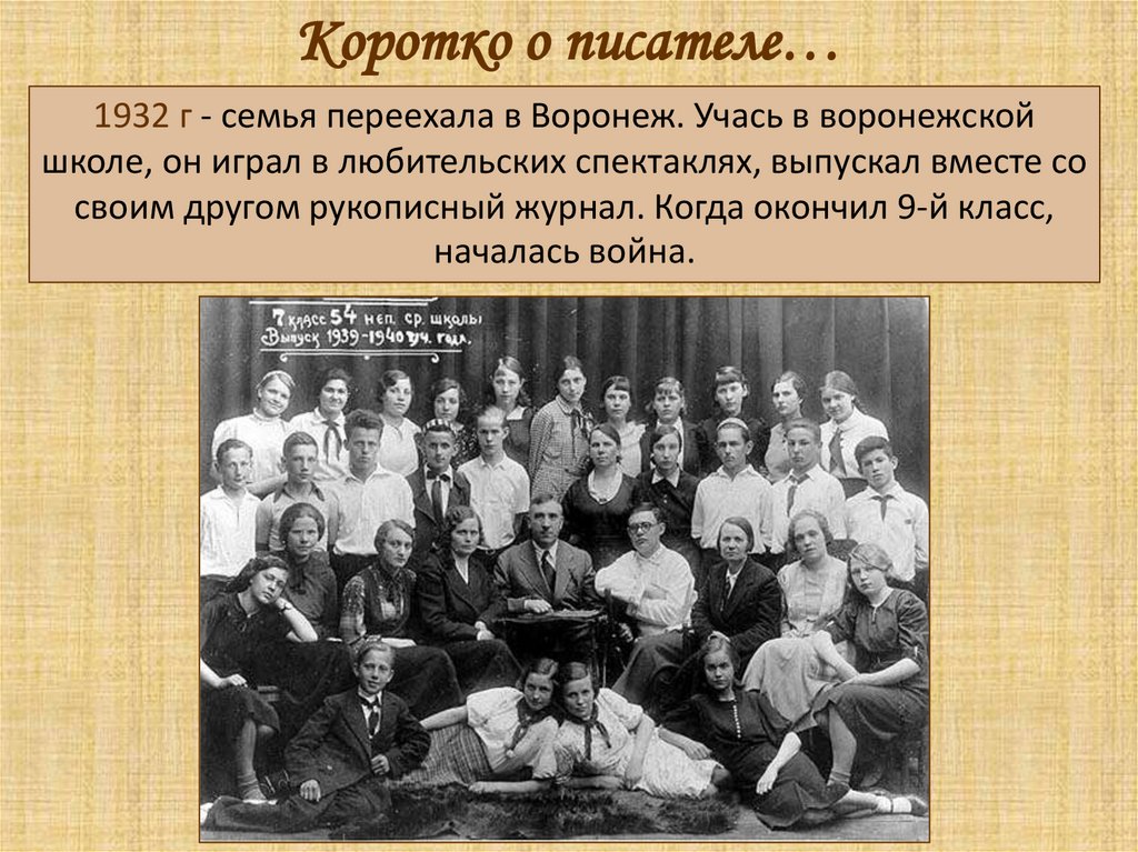 Коротко о писателе…1932 г - семья переехала в Воронеж. Учась в воронежской