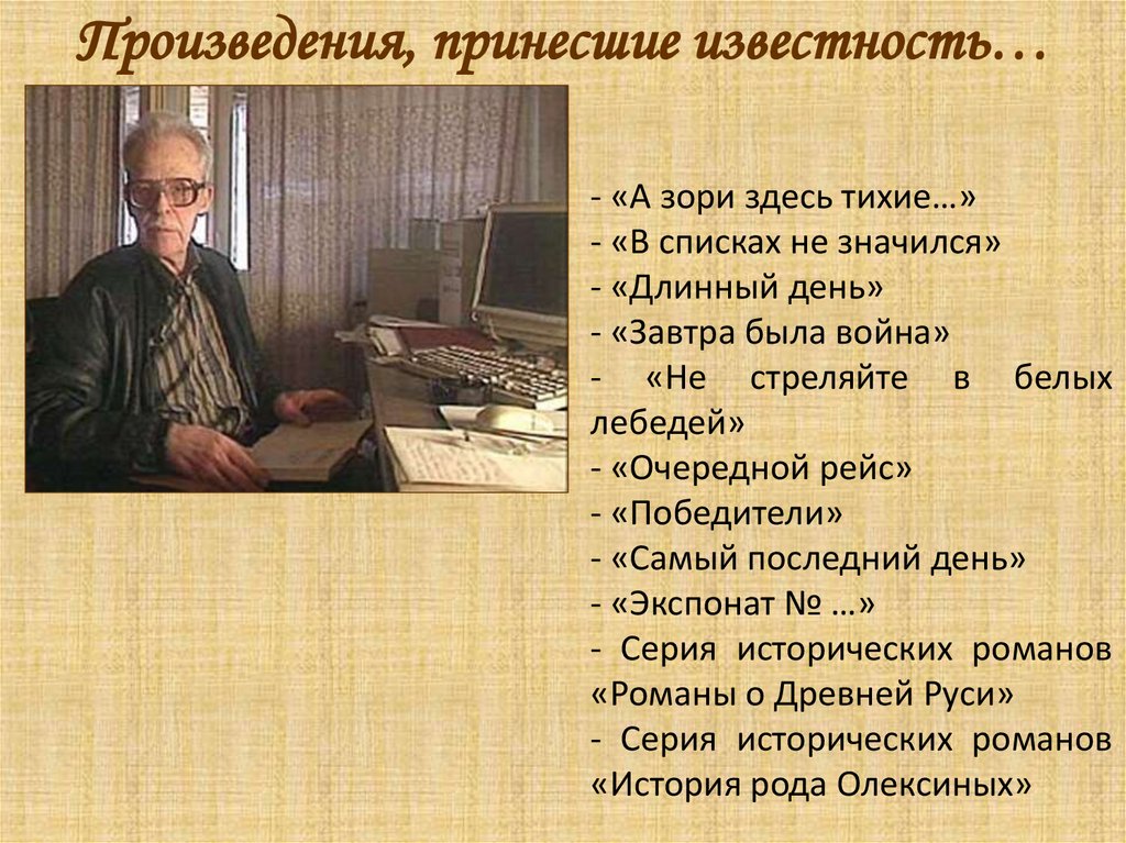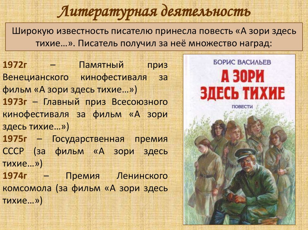 Литературная деятельностьШирокую известность писателю принесла повесть «А зори здесь