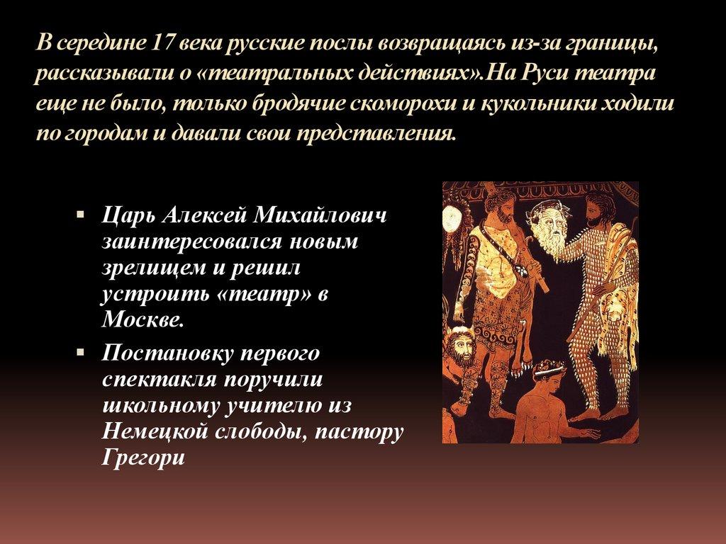 В середине 17 века русские послы возвращаясь из-за границы,рассказывали о «театральных действиях».На Руси театра
