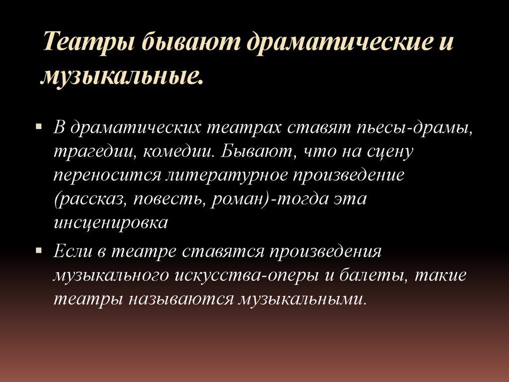Театры бывают драматические имузыкальные.