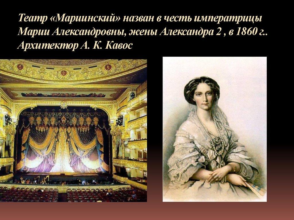 Театр «Мариинский» назван в честь императрицыМарии Александровны, жены Александра 2 , в 1860 г..