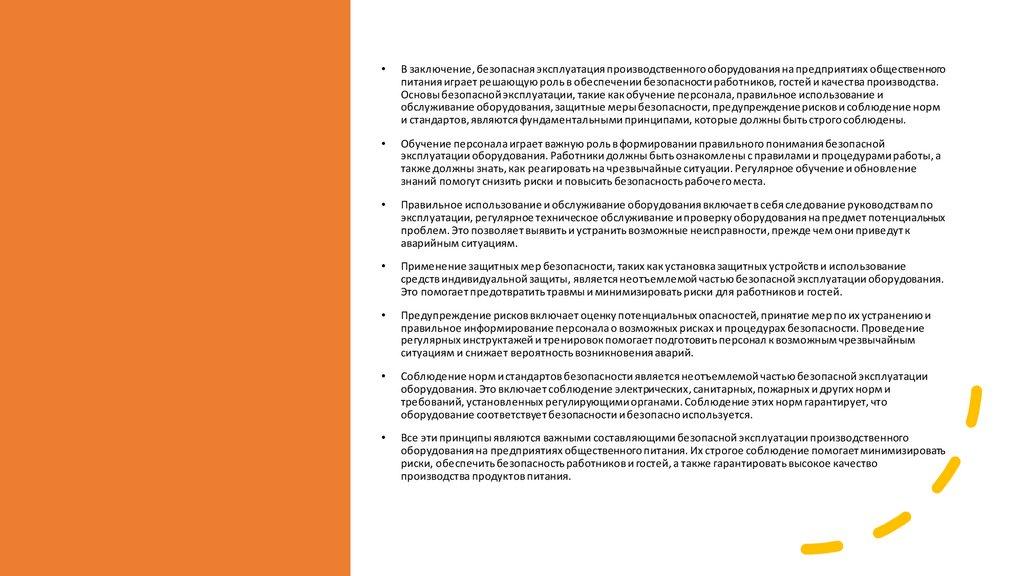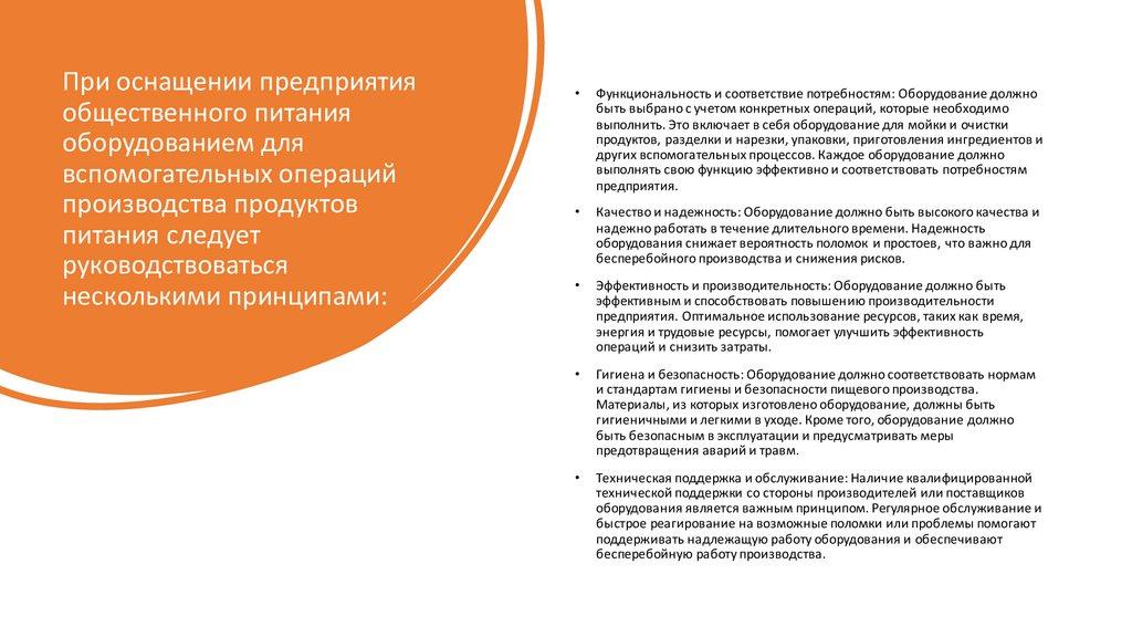 Гигиена и безопасность: Оборудование должно соответствовать требованиям санитарных норм и правил безопасности пищевого производства. Оно