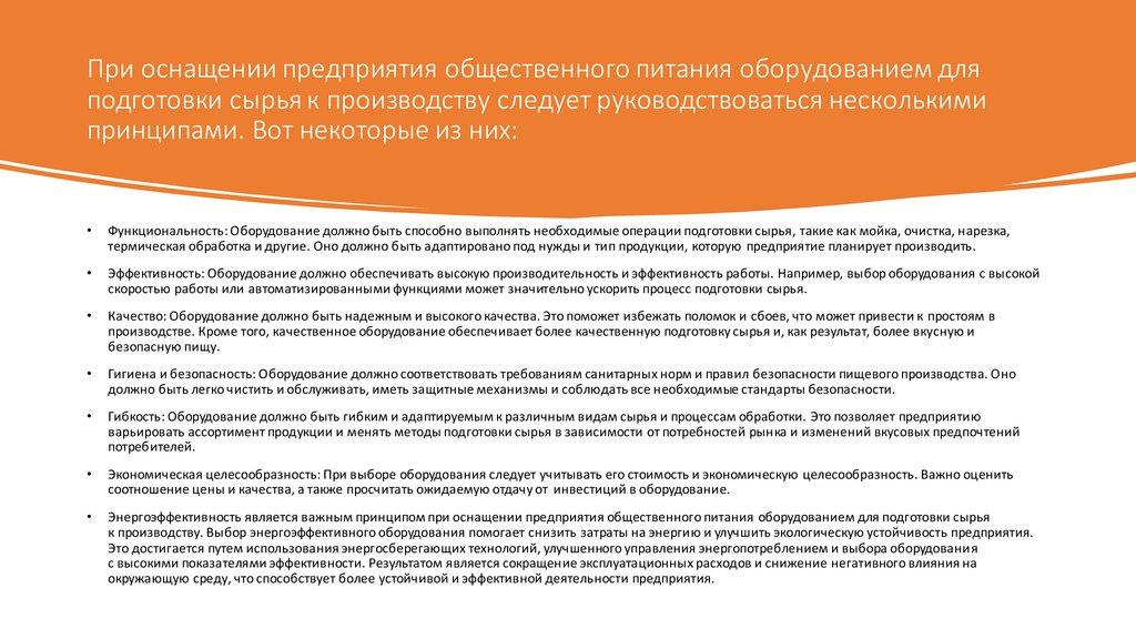 При оснащении предприятия общественного питания оборудованием дляподготовки сырья к производству следует руководствоваться несколькими