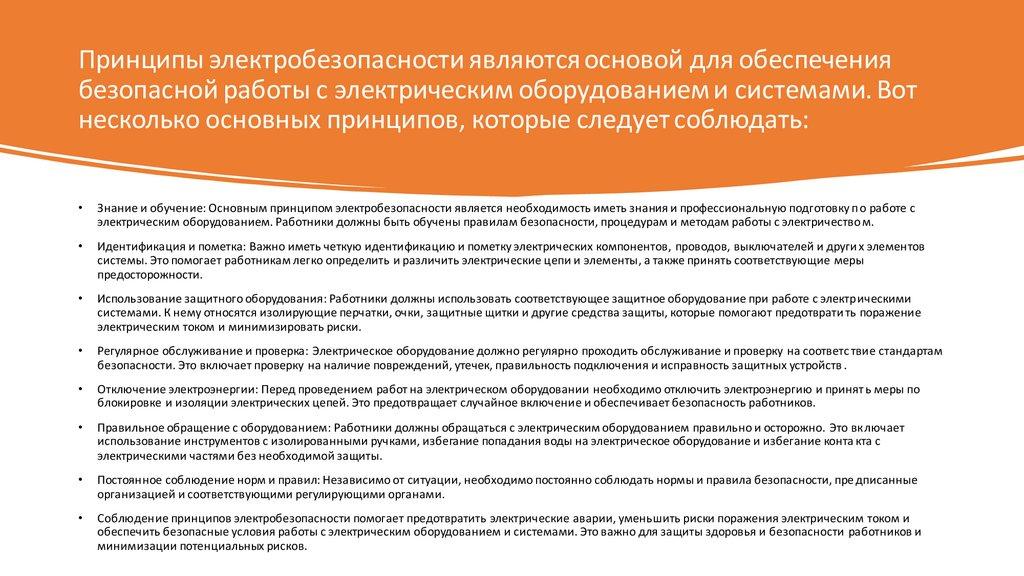 Принципы электробезопасности являются основой для обеспечениябезопасной работы с электрическим оборудованием и системами. Вот