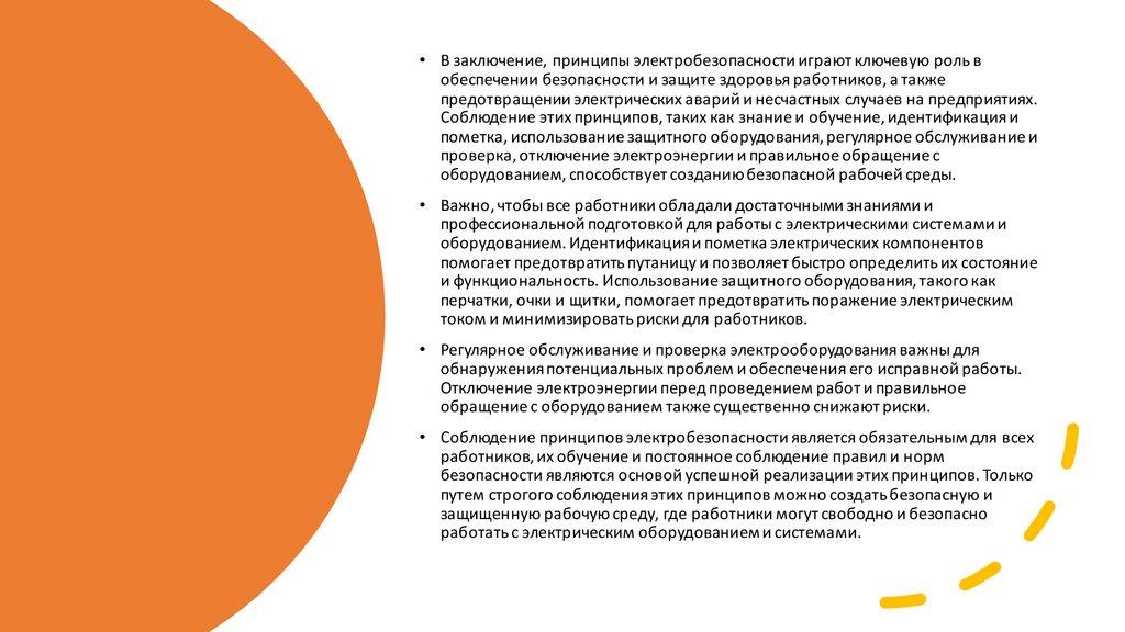• В заключение, принципы электробезопасности играют ключевую роль вобеспечении безопасности и защите здоровья работников, а также