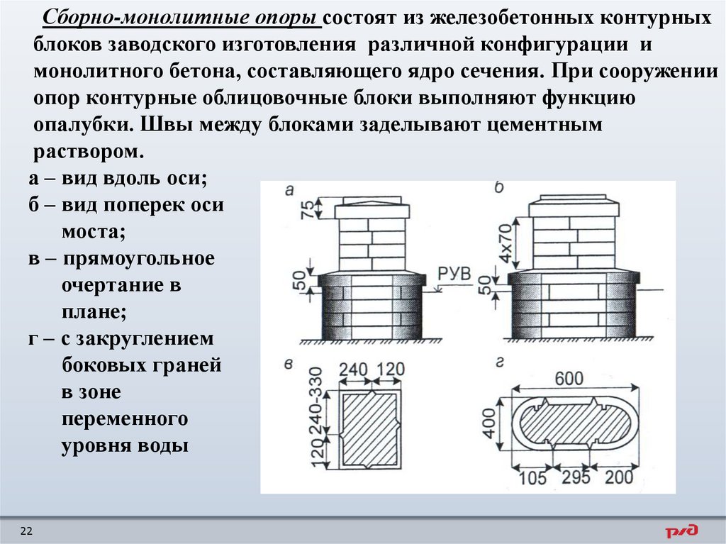 • пустотелые опоры, выполняемые из монолитногобетона или из замкнутых бетонных блоков