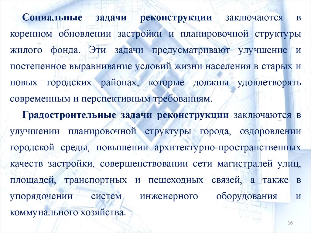 Реконструкция жилых зданий и жилой застройки в целомпозволяет решать следующие задачи: