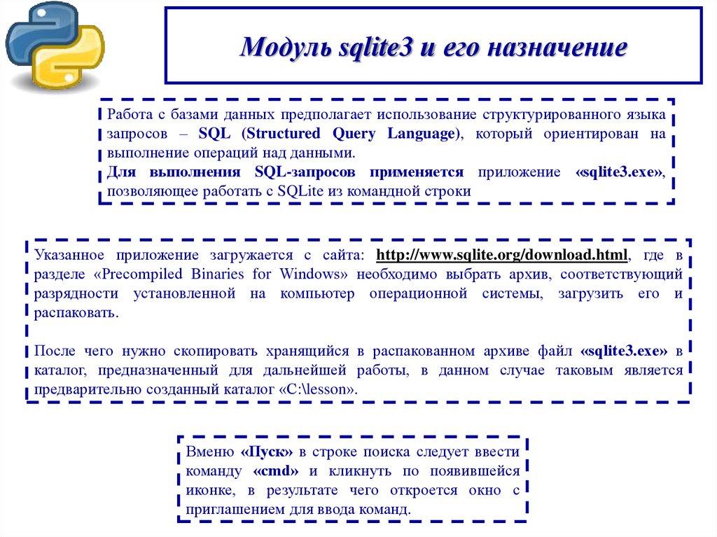 Модуль sqlite3 и его назначениеРабота с базами данных предполагает использование структурированного языка