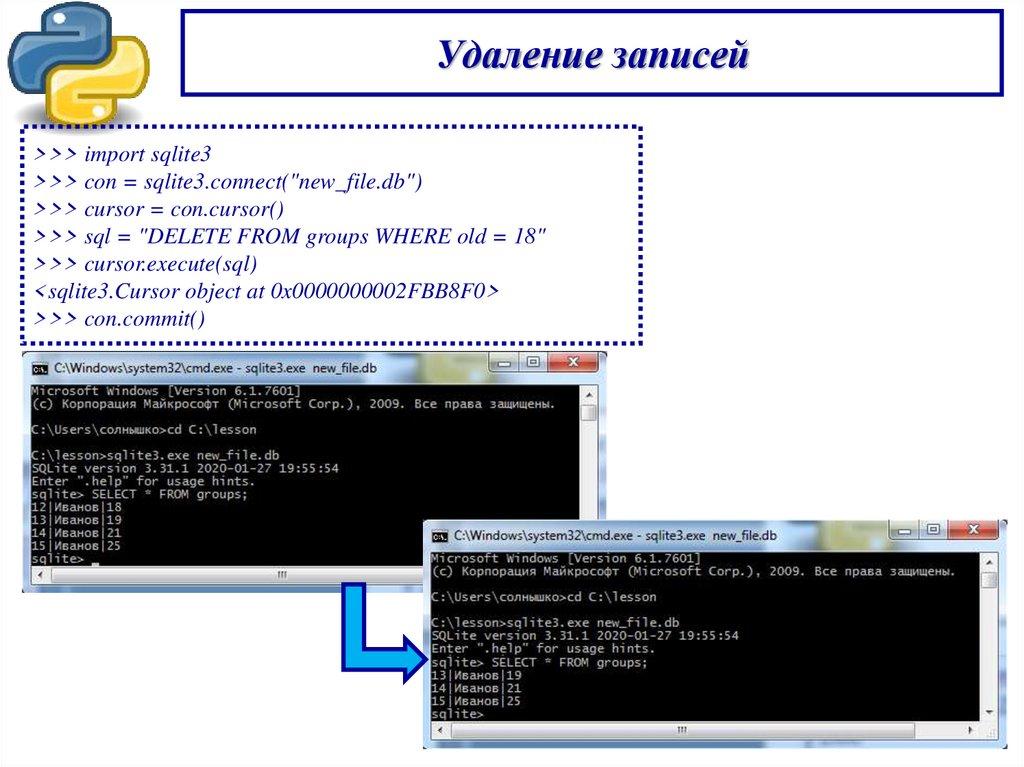 Удаление записей>>> import sqlite3