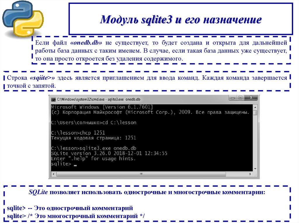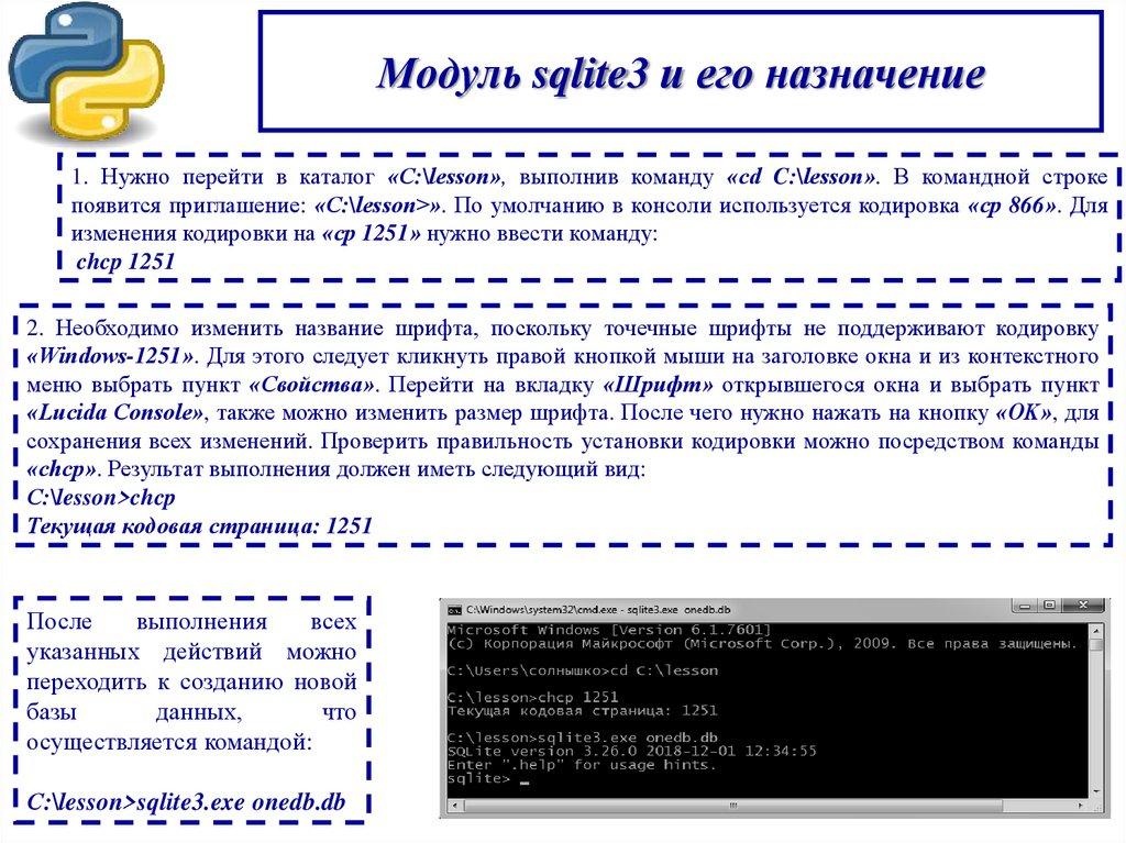 Модуль sqlite3 и его назначение1. Нужно перейти в каталог «C:\lesson», выполнив команду «cd C:\lesson». В командной строке