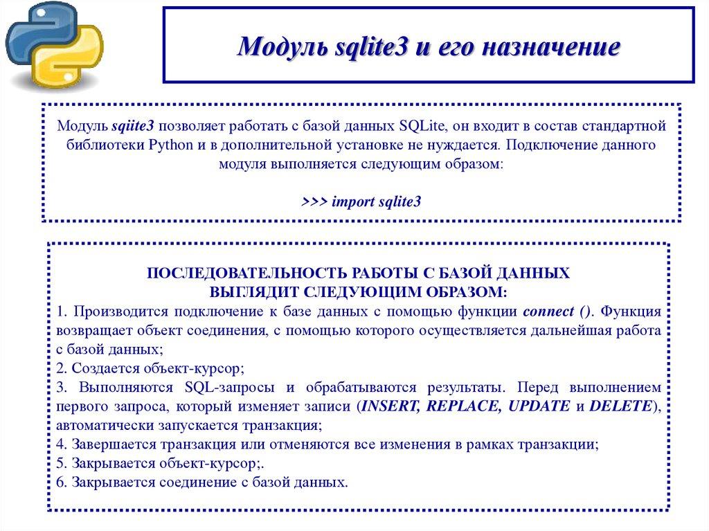 Модуль sqlite3 и его назначениеМодуль sqiite3 позволяет работать с базой данных SQLite, он входит в состав стандартной