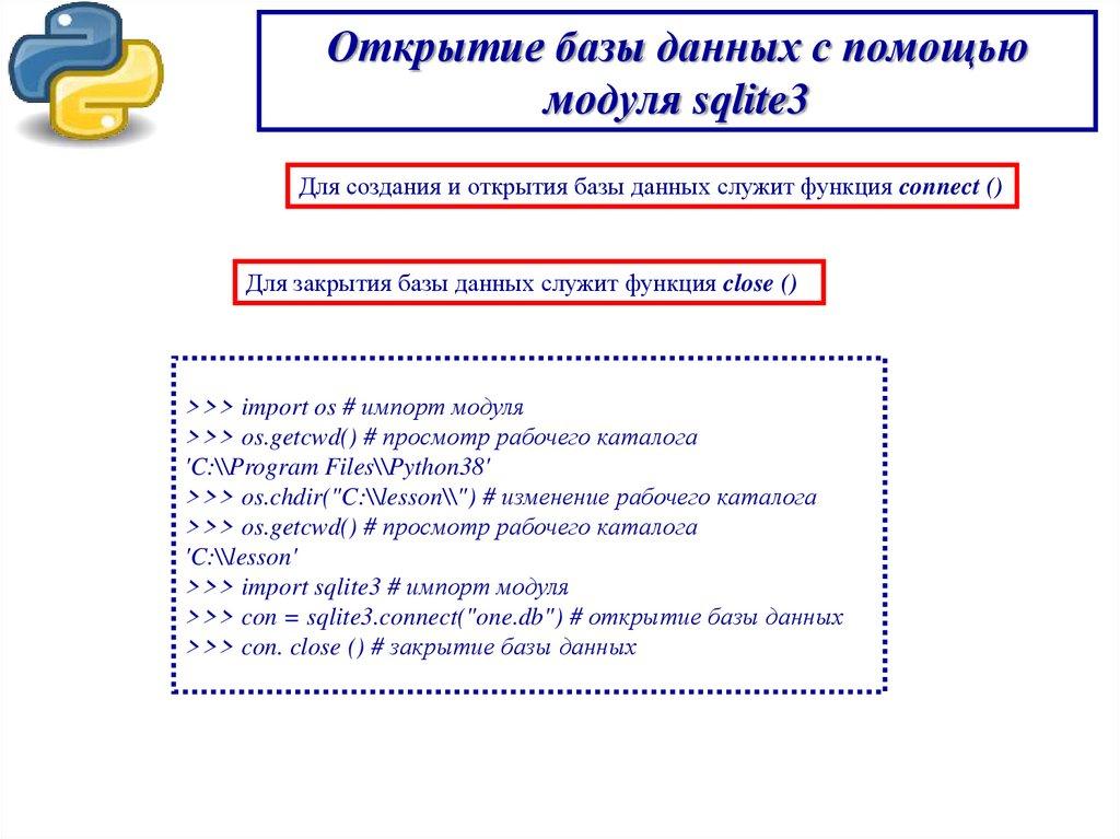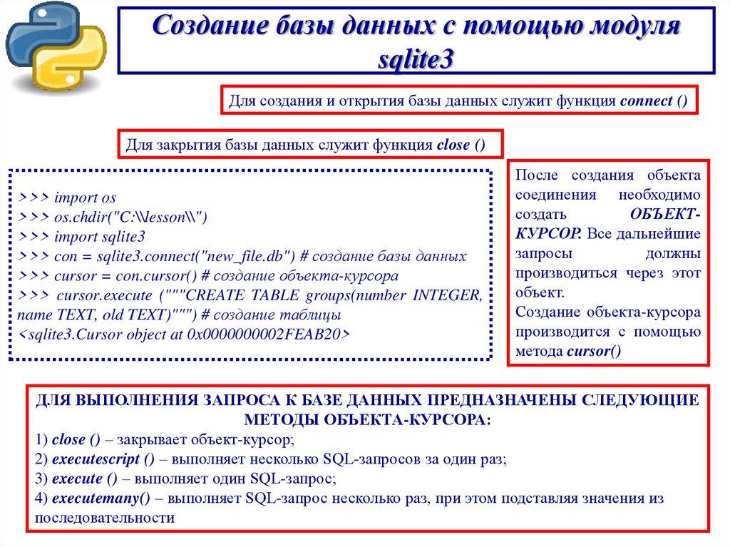 Модуль sqlite3 и его назначениеЕсли файл «onedb.db» не существует, то будет создана и открыта для дальнейшей