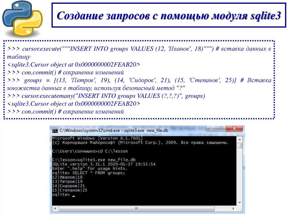 Создание запросов с помощью модуля sqlite3>>> cursor.execute("""INSERT INTO groups VALUES (12, 'Иванов', 18)""") # вставка данных в